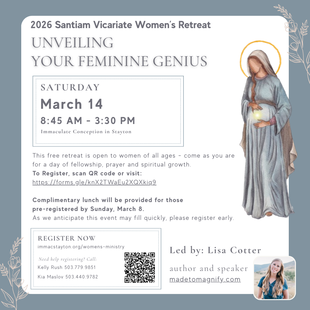 Women's Bible Study meets throughout the year on Wednesdays at 9:30 AM in the conference room inside the parish office. All women are welcome! Questions please call the parish office 503-769-2656.